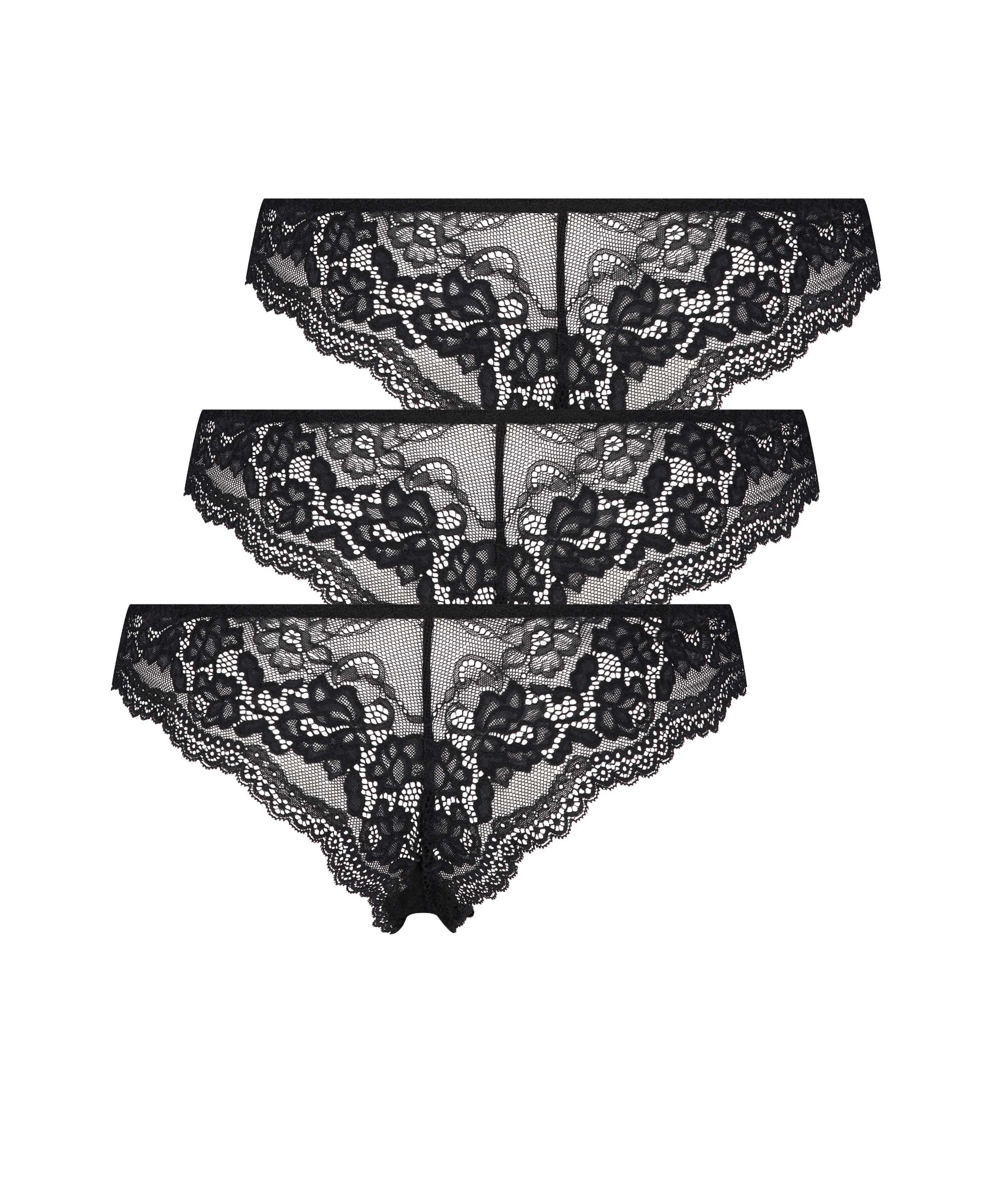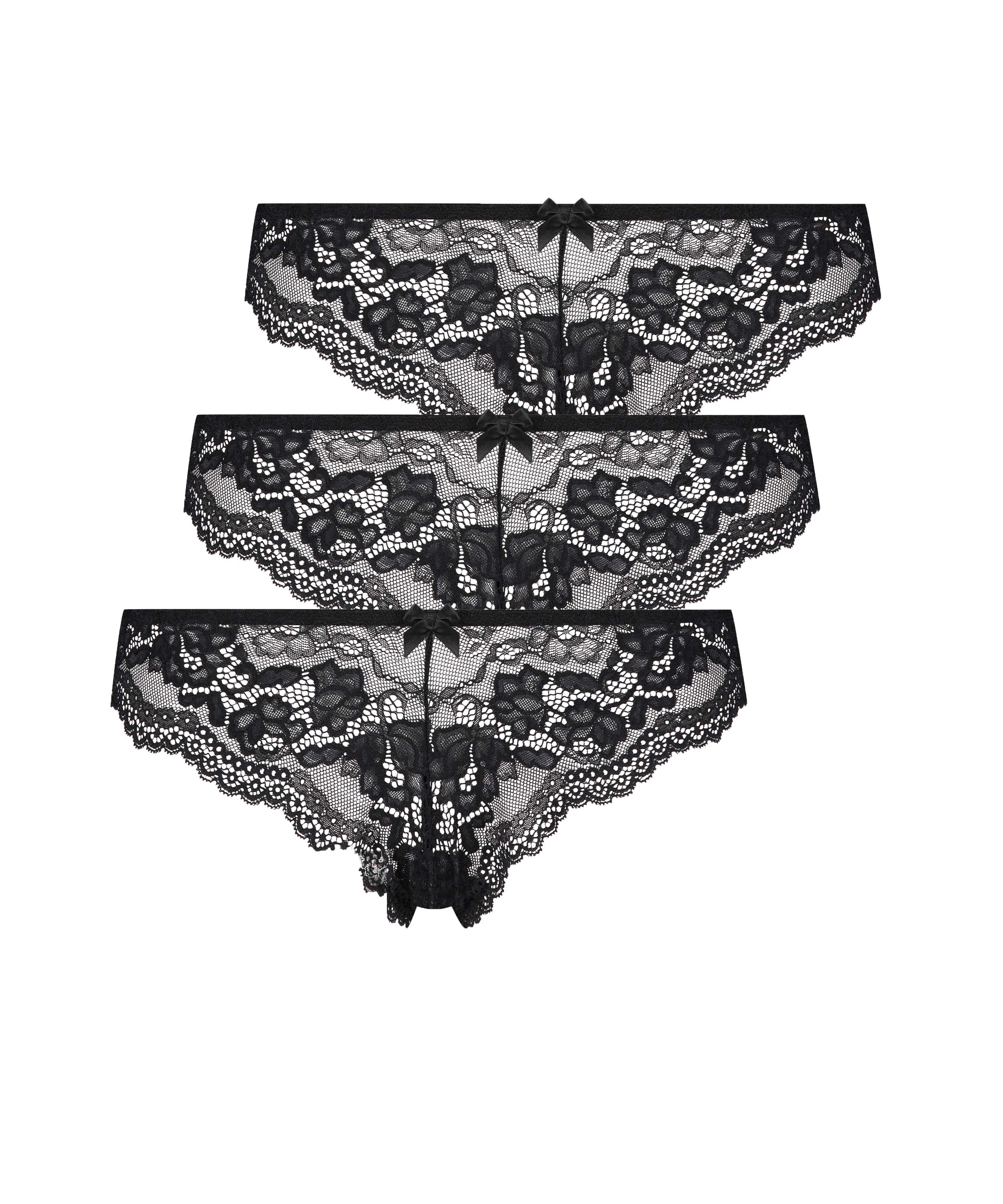 Fühle Dich sexy in diesen Brazilians! Sie sind komplett mit Spitze verarbeitet und haben als zusätzliches Detail eine kleine Schleife auf der Vorderseite. Praktisch im 3er-Pack, damit Du jeden Tag fabelhaft aussiehst.