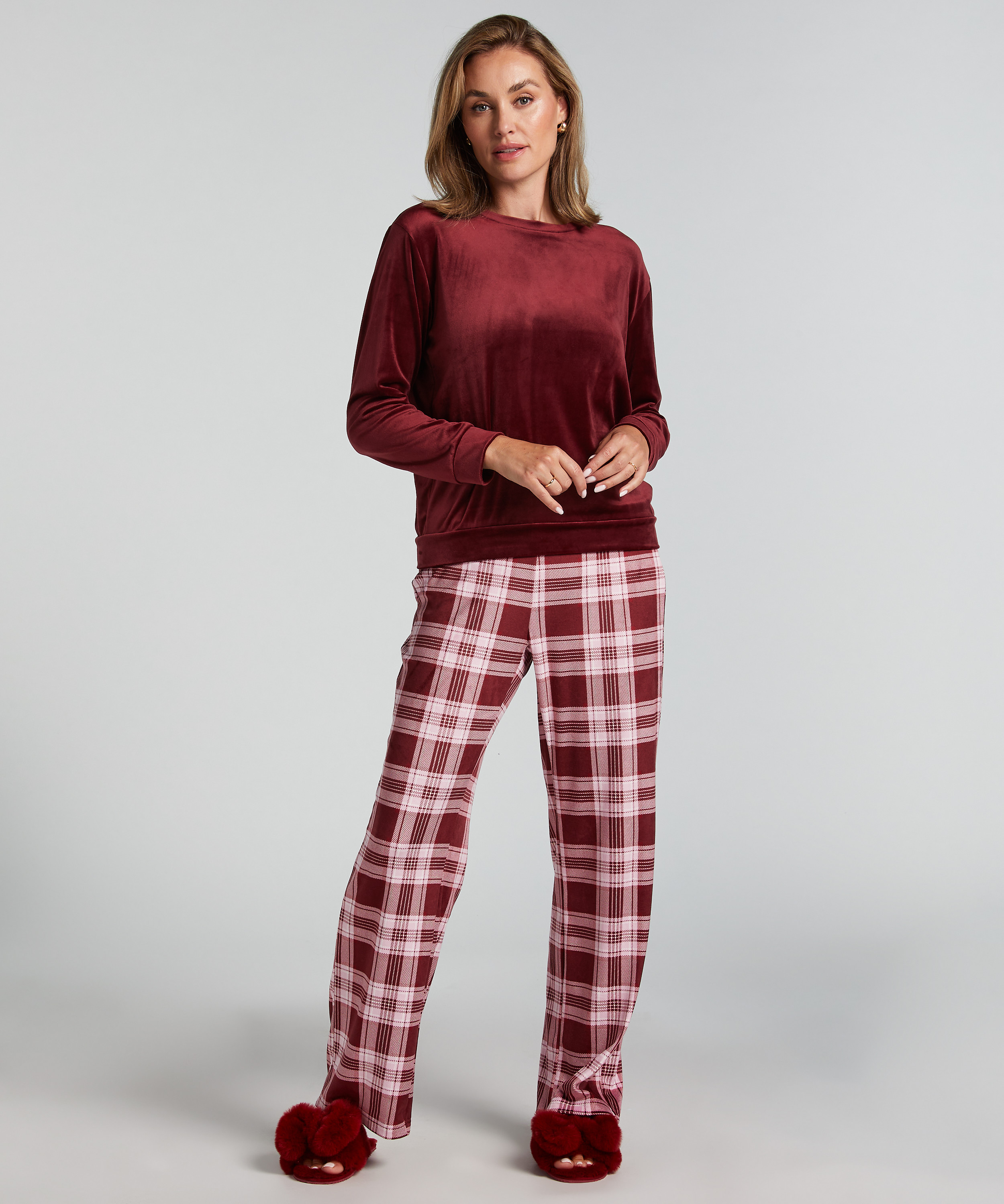 Mit diesem hübschen Pyjamaset sind Sie auf einmal fertig für den Abend! Das Top hat lange Ärmel. Die Hose hat lange, weitere Beine und Gummi im Bund. Perfekt also!