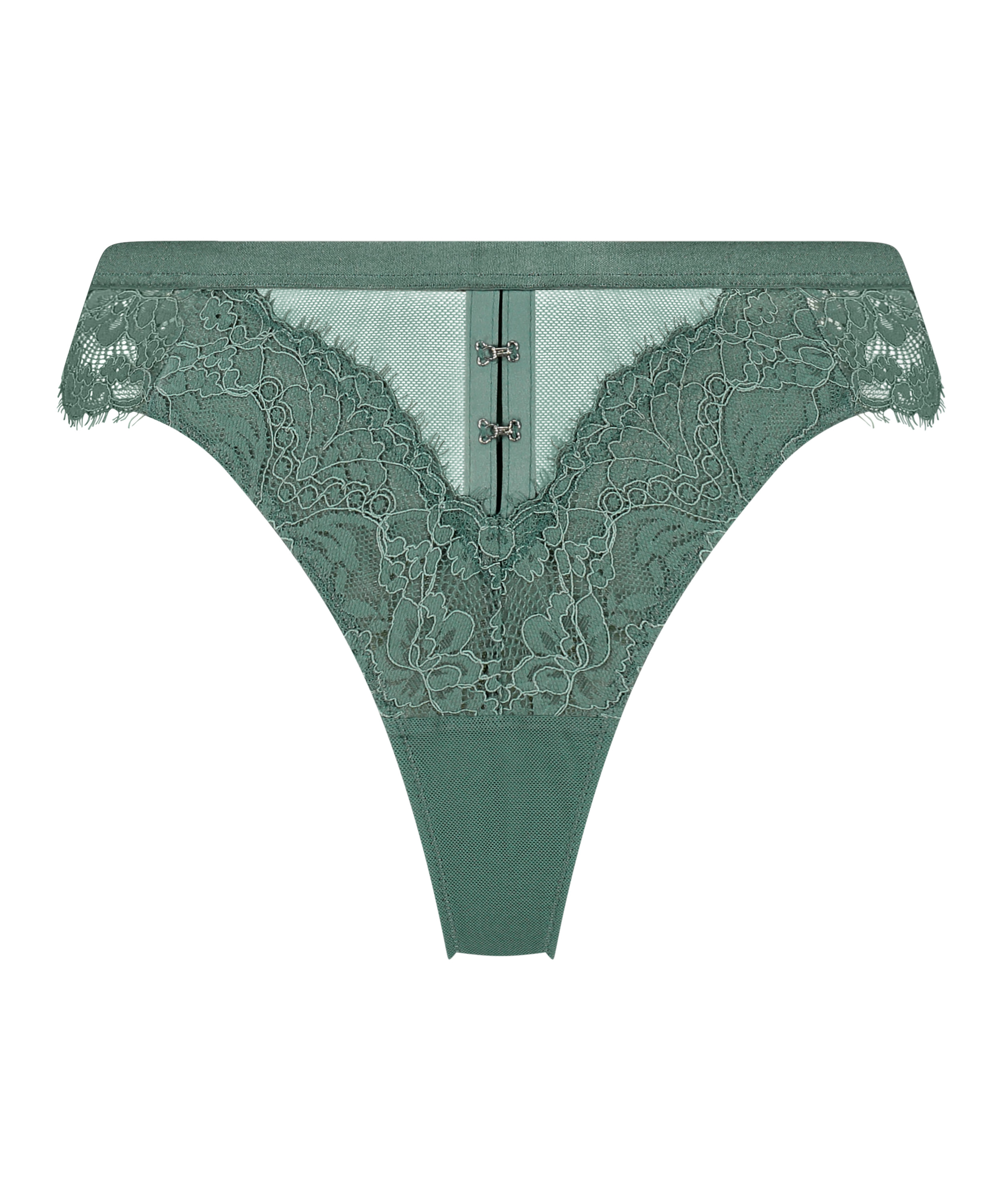 Erlebe das pure Gefühl mit unserem verführerischen String! Dieser String ist mit aufwändiger Spitze verziert und hat einen Haken- und Ösen-Verschluss vorne, die durch verführerisches Netz-Gewebe hinten ergänzt werden, damit du dich unwiderstehlich sexy fühlst. Kombiniere ihn mit deinem passenden Lieblings-BH und starte selbstbewusst und verführerisch in den Tag!