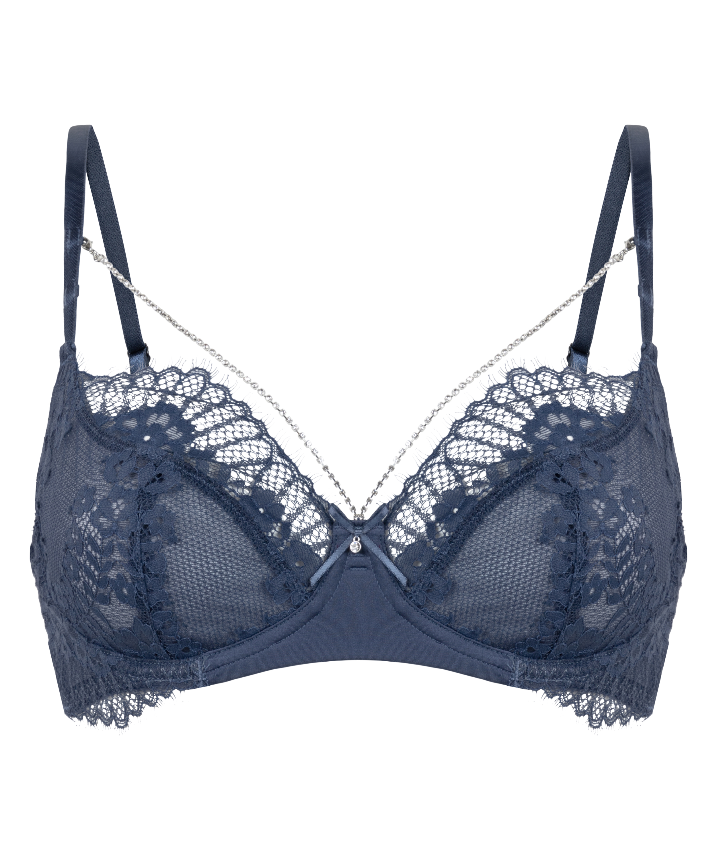 Fühl dich unwiderstehlich sexy in diesem ungepolsterten Bügel-BH! Mit verführerischer Spitze und einer süßen Schleife zwischen den Cups. Inklusive abnehmbarer Kette für extra Style. Hol dir die passenden Höschen, um dein Set perfekt zu machen!