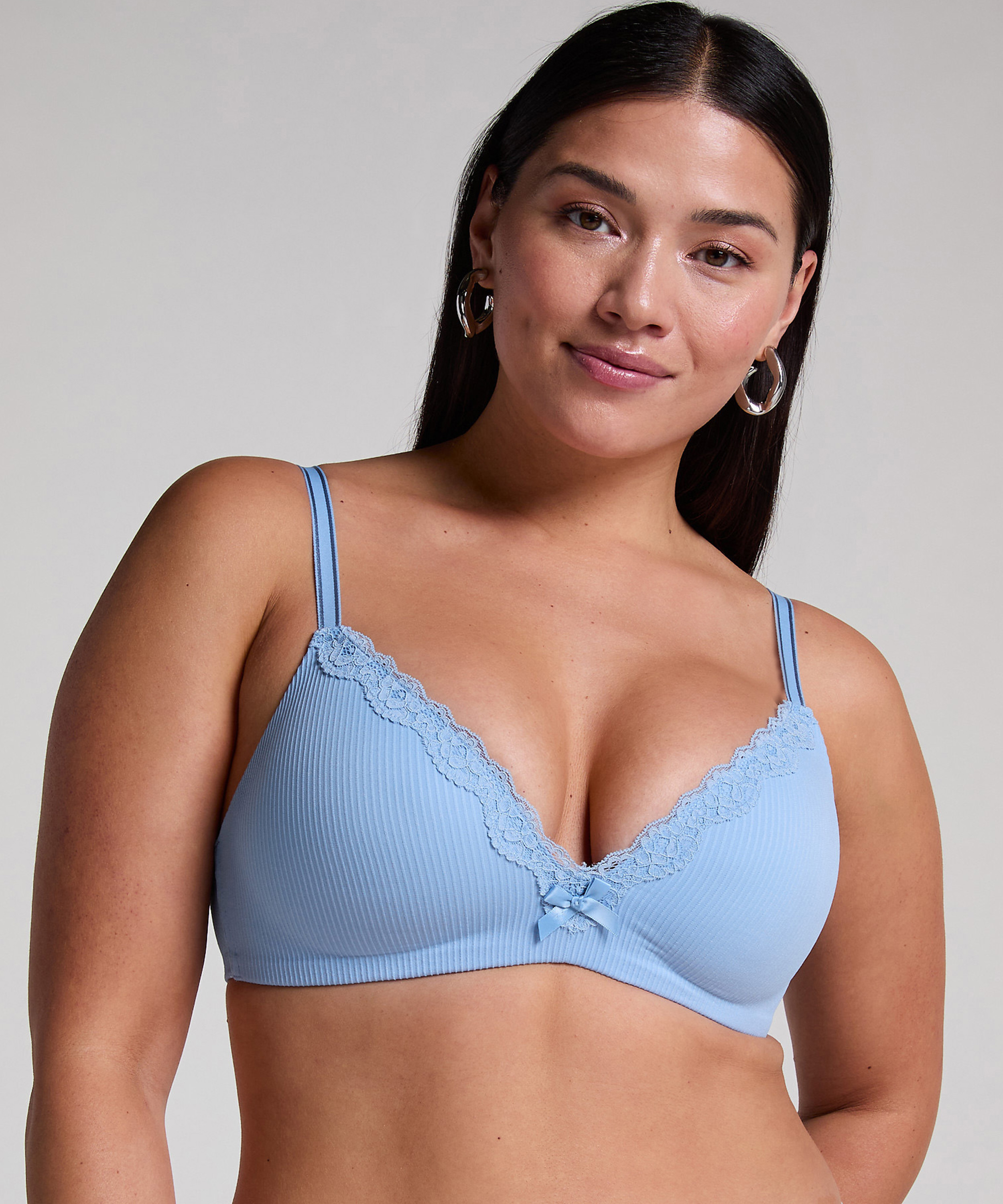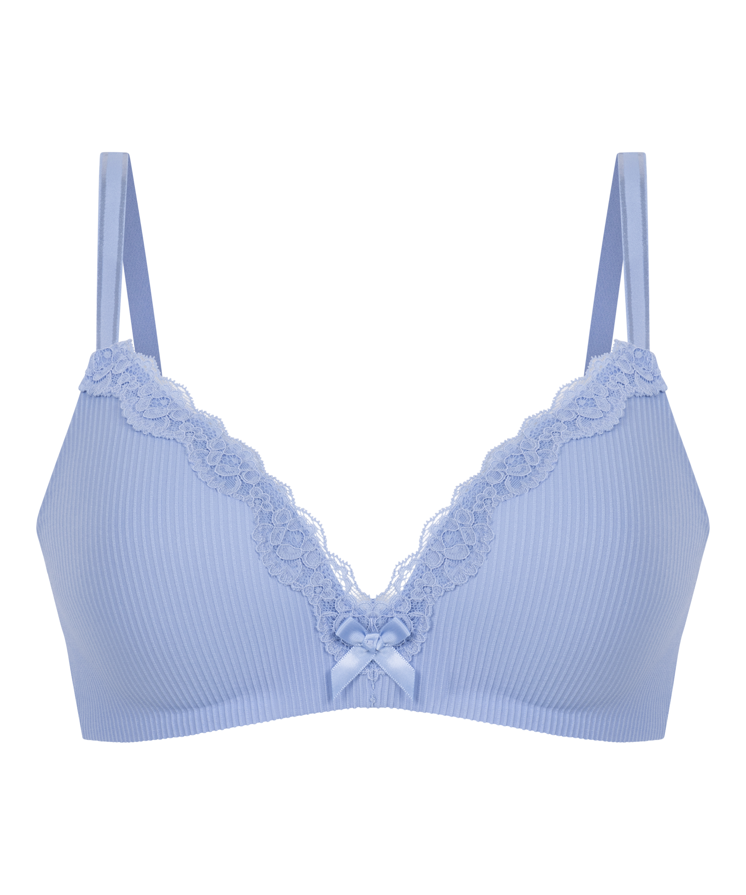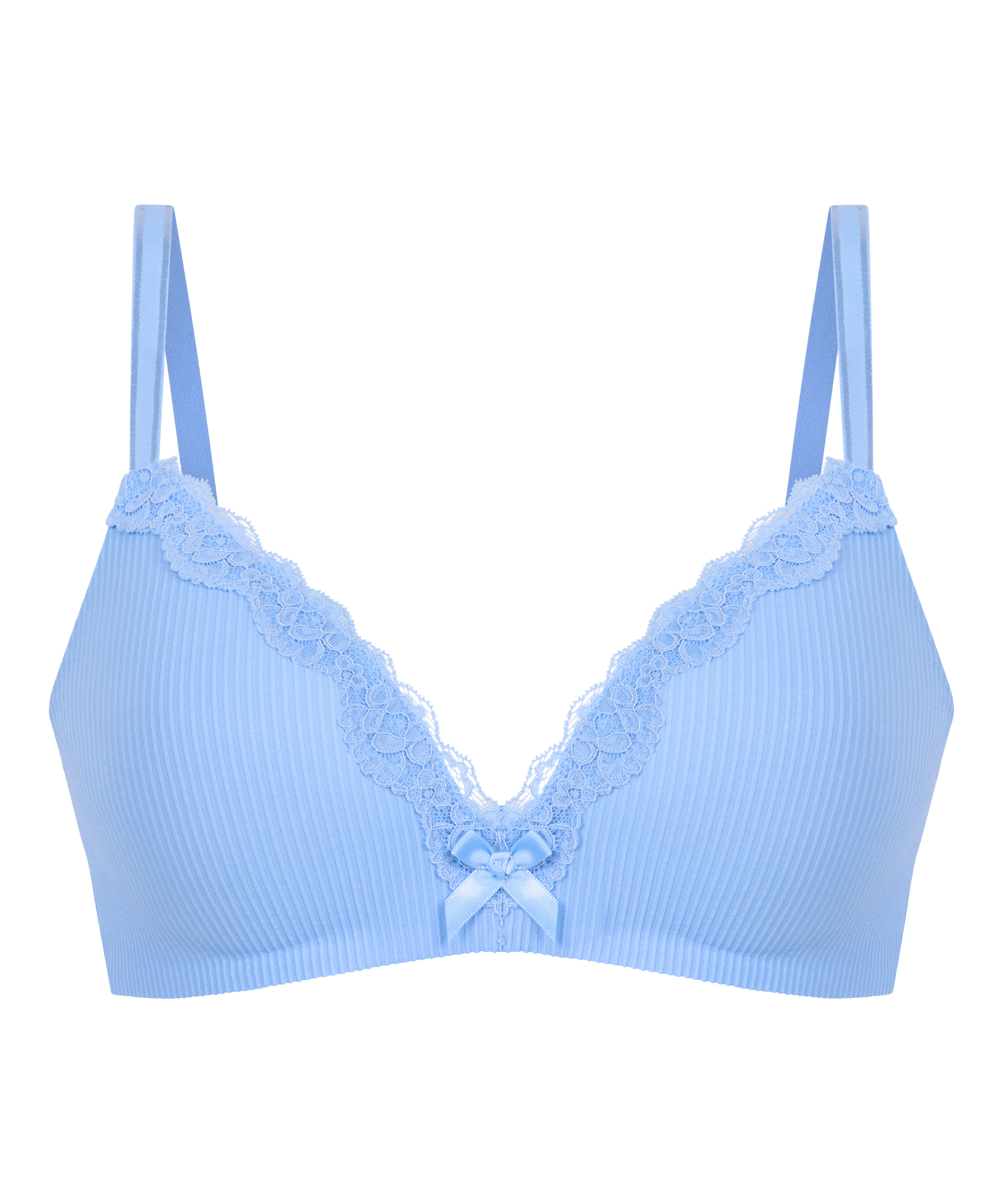 Ein hübscher BH mit einem schönen Spitzenbesatz und einer süßen Schleife vorne. Der BH ist vorgeformt und hat keine Bügel. Kombiniere ihn mit einem passenden Slip.